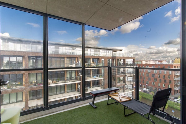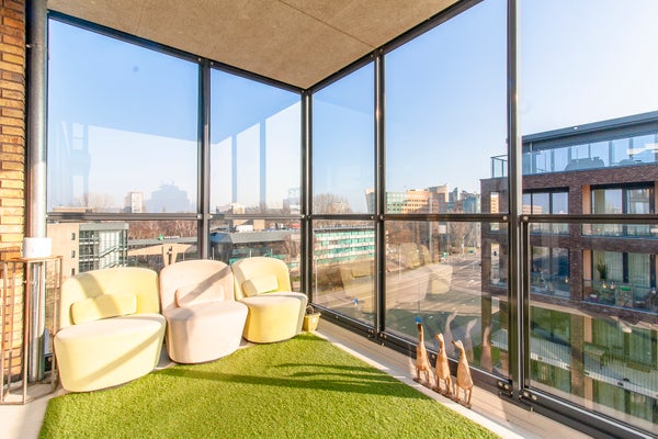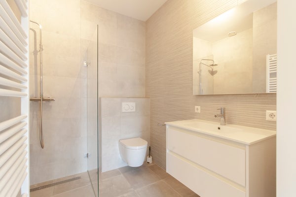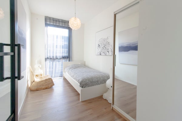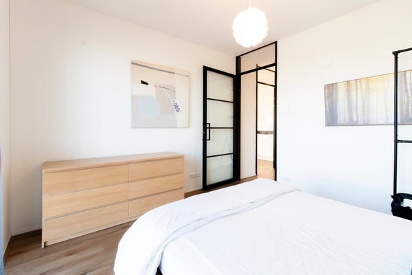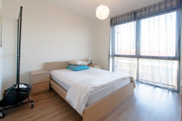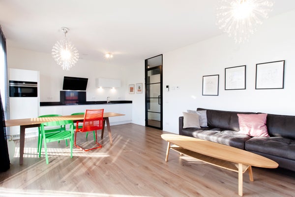 Este elegante apartamento de nueva construcción se completó en 2018 y está disponible para alquiler amueblado. El apartamento en esquina se encuentra en el sexto piso de un complejo de apartamentos bien mantenido y es accesible a través de una escalera o ascensor. Hay un pasillo en la entrada del apartamento desde el cual se puede acceder a todas las habitaciones. También hay un baño separado. El apartamento cuenta con una encantadora sala de estar y una cocina abierta. La cocina está totalmente equipada con un refrigerador con congelador, un horno combinado/microondas, un lavavajillas y una estufa eléctrica de 4 fuegos con una campana de lujo. Además, la cocina ofrece suficiente espacio de almacenamiento. La sala de estar tiene acceso a un balcón orientado al sureste. La habitación principal está situada en el lado norte del apartamento y está amueblada con una cama doble y dos cómodas. La segunda habitación está ubicada en el lado este del apartamento e incluye una cama individual, un armario y un pequeño banco. El moderno y tranquilo baño está equipado con una ducha a ras de suelo con pared de vidrio, un inodoro y un mueble lavabo. Toda la propiedad tiene calefacción por suelo radiante y tiene una etiqueta de energía A. Hay un garaje subterráneo en este hermoso complejo de apartamentos. Un espacio de estacionamiento privado está disponible para el inquilino por 150,00 € al mes.