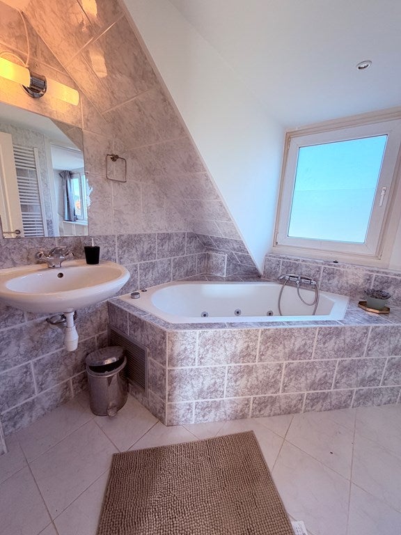 Baño de lujo con bañera, ducha separada, lavabo y radiador de diseño