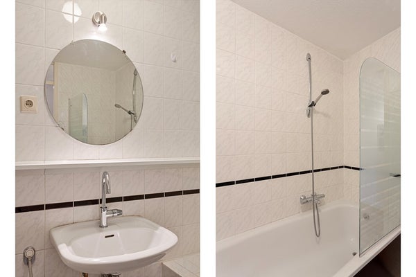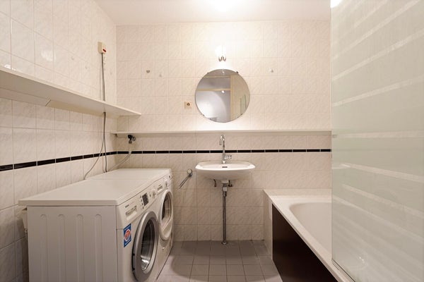 El dormitorio principal tiene una cama para 2 personas y un armario. El baño es agradablemente espacioso con una bañera, una ducha, lavadora y secadora. Fuera del vestíbulo encontrará un aseo separado.