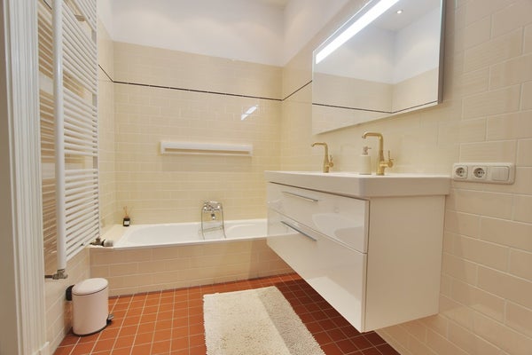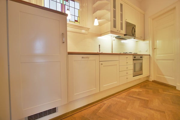 Sala de estar luminosa y brillante al frente con 5 ventanas con vistas al "Rijksmuseum", con altos techos ornamentados y suelos de parquet de espiga de madera en todo el apartamento. Cocina semiabierta totalmente equipada. Habitación lateral con balcón.