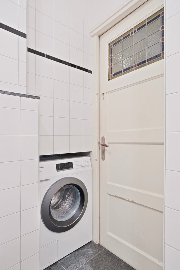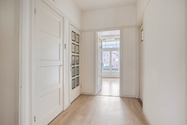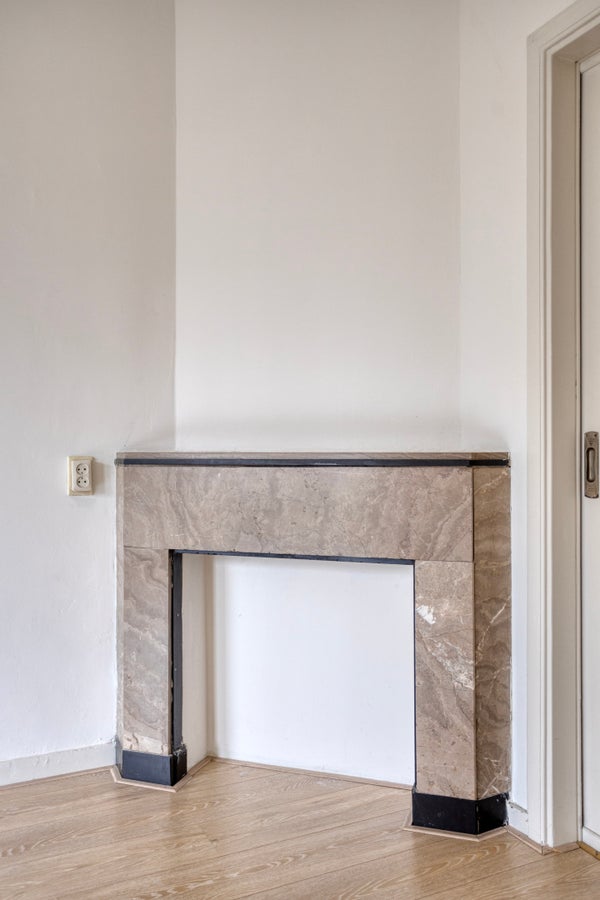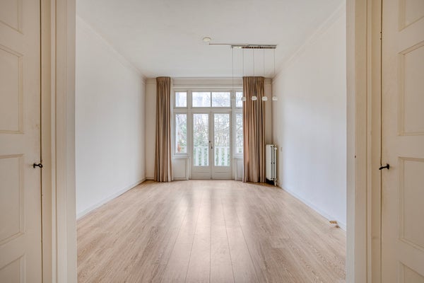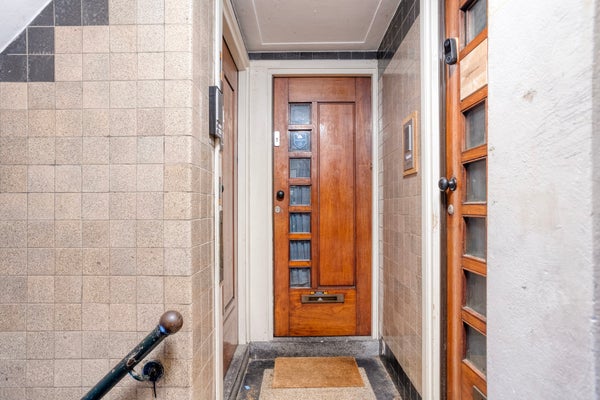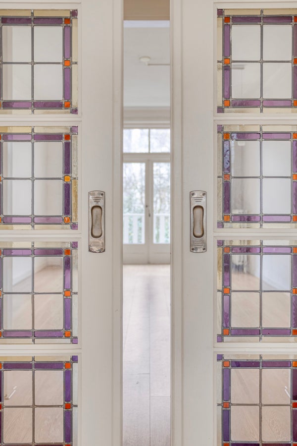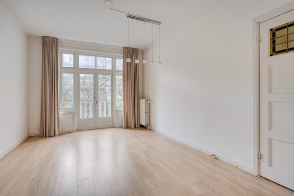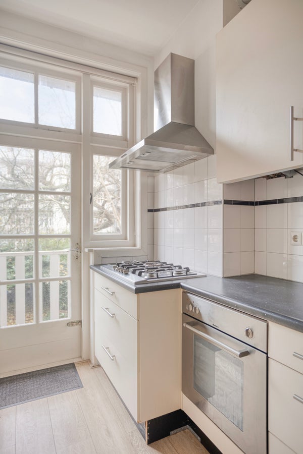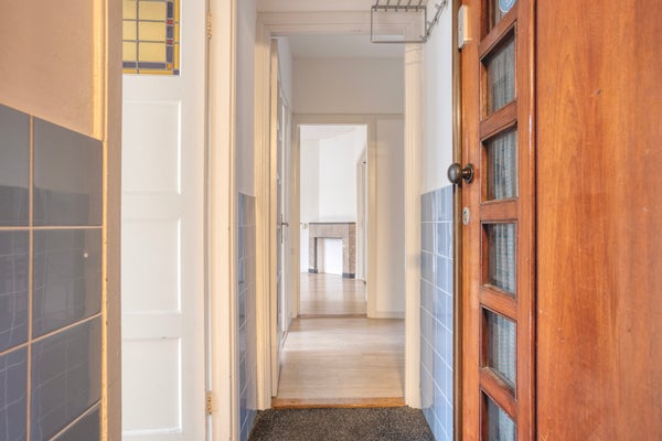 Al entrar en el apartamento, el carácter auténtico del hogar destaca de inmediato. Las grandes ventanas, los detalles en vitrales y una clásica chimenea brindan al salón en suite una atmósfera cálida y elegante. Las áreas de estar y comedor están conectadas por puertas correderas originales, creando dos espacios amplios que reciben mucha luz natural a través de las puertas francesas tanto en la parte delantera como en la trasera. En la parte trasera, la vista da a un tranquilo patio verde, mientras que el frente da a la impresionante Churchilllaan.