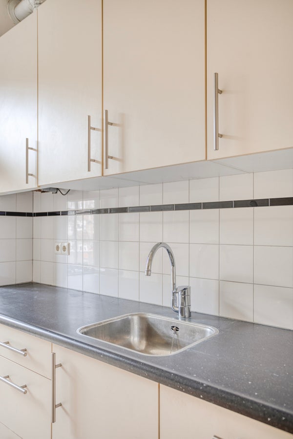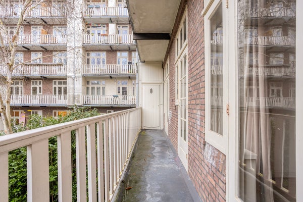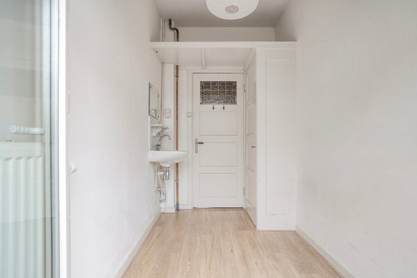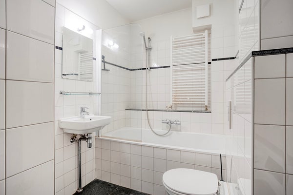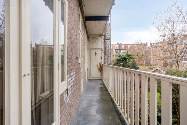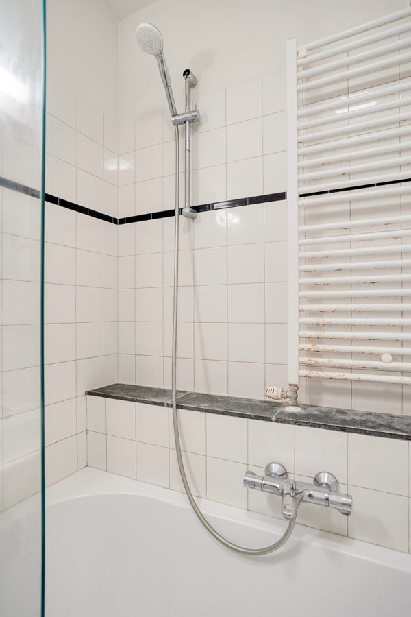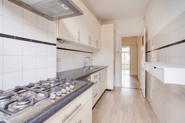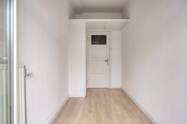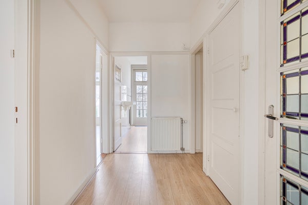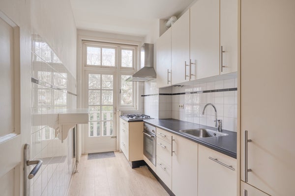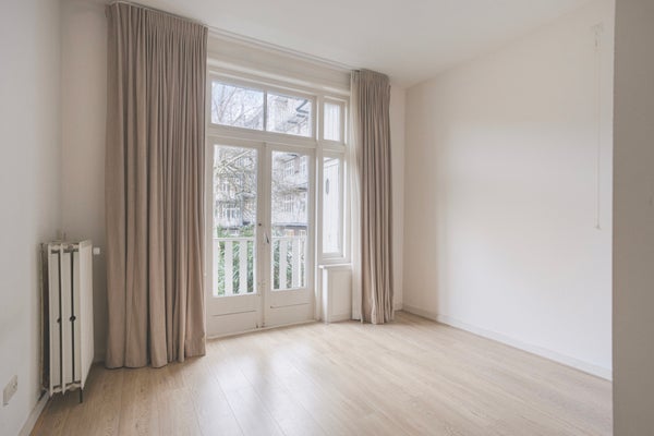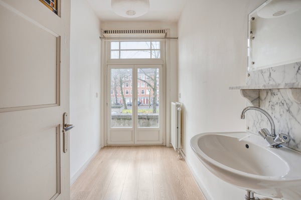 Al entrar en el apartamento, el carácter auténtico del hogar destaca de inmediato. Las grandes ventanas, los detalles en vitrales y una clásica chimenea brindan al salón en suite una atmósfera cálida y elegante. Las áreas de estar y comedor están conectadas por puertas correderas originales, creando dos espacios amplios que reciben mucha luz natural a través de las puertas francesas tanto en la parte delantera como en la trasera. En la parte trasera, la vista da a un tranquilo patio verde, mientras que el frente da a la impresionante Churchilllaan.