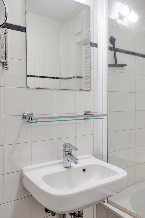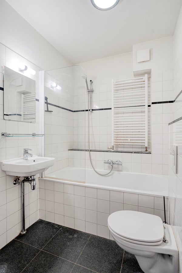 El baño incluye una bañera con ducha, un lavabo, un radiador para toallas y una conexión para lavadora. El apartamento se ofrece semi-amueblado y está disponible de inmediato.