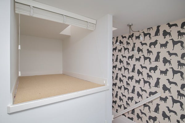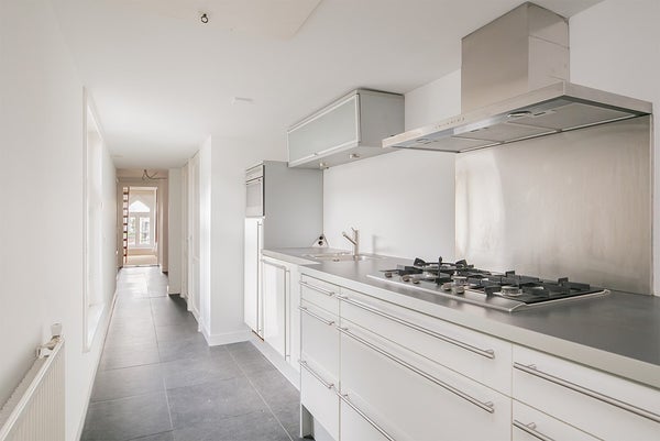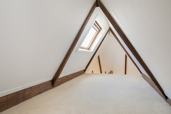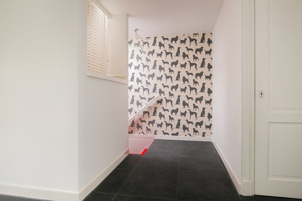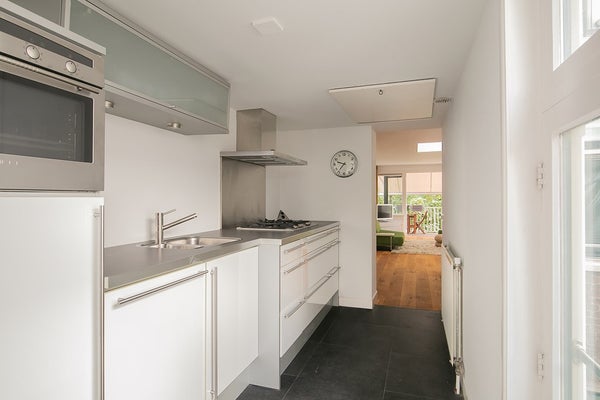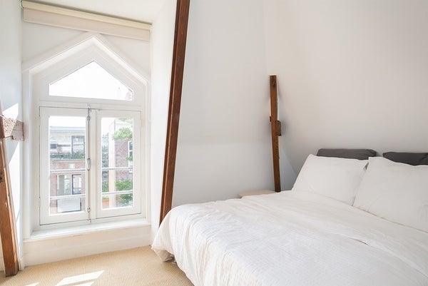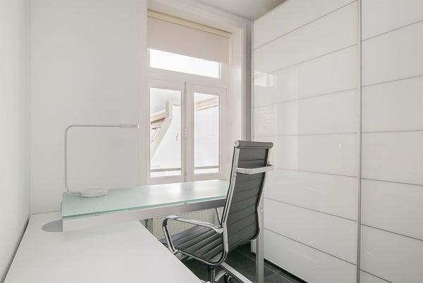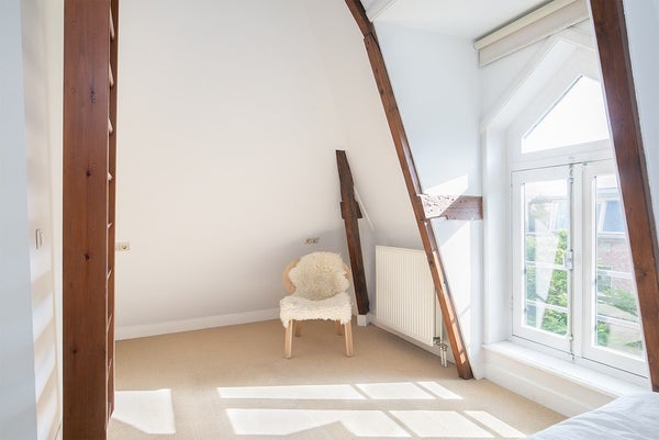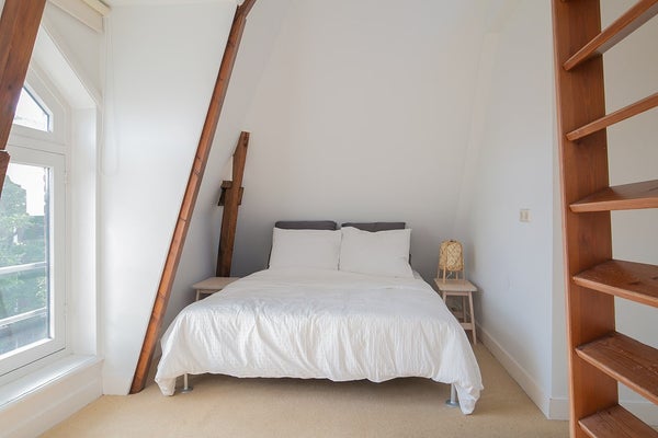 La habitación principal está situada en la parte delantera del edificio y da a la tranquila calle Da Costastraat. A través de una pequeña escalera, puedes llegar a otra habitación debajo del techo donde también podría colocarse una cama.