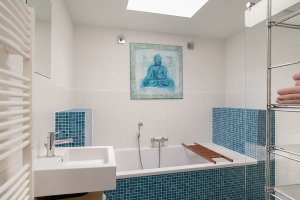 El baño cuenta con una ducha a ras de suelo, inodoro, lavabo y un gran lucernario.