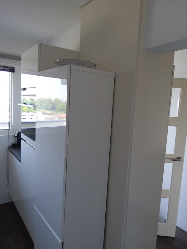 Moderna cocina individual completamente equipada con nevera, congelador, horno combinado y cocina de gas.
