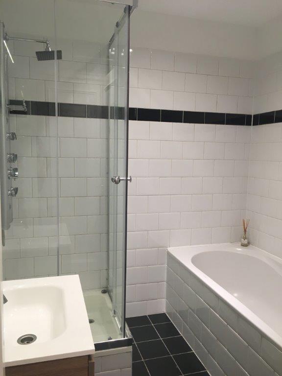 El baño tiene una ducha separada, una bañera y un lavabo.