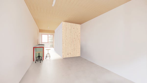 El estudio se entregará sin suelo, para que puedas decorarlo a tu gusto. Las paredes ya están terminadas y el apartamento está equipado con iluminación y cortinas. Además, el estudio cuenta con una cocina completa con todos los electrodomésticos necesarios. Gracias a la calefacción y refrigeración por suelo radiante a través de Innax, vivirás aquí cómodamente todo el año (aproximadamente 100 € al mes).