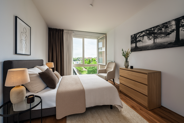 Una escalera interna conduce al nivel de descanso con dos dormitorios. El dormitorio principal es amplio y luminoso, mientras que la segunda habitación es ideal como dormitorio infantil o oficina en casa. Ambas habitaciones tienen ventanas que se pueden abrir por completo, trayendo el exterior al interior. El moderno baño cuenta con una bañera, un mueble lavabo y una cabina de ducha.
