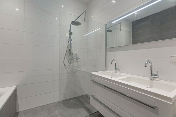 El baño elegantemente terminado cuenta con un lavabo doble, bañera y ducha a ras de suelo. También hay un aseo separado con lavabo en el pasillo y una disposición separada para la lavadora/secadora.