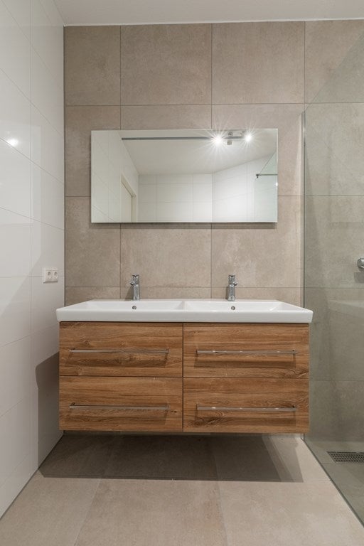 El apartamento está equipado con un amplio baño moderno con ducha a ras de suelo, lavabo doble, calefacción por suelo radiante y toallero.