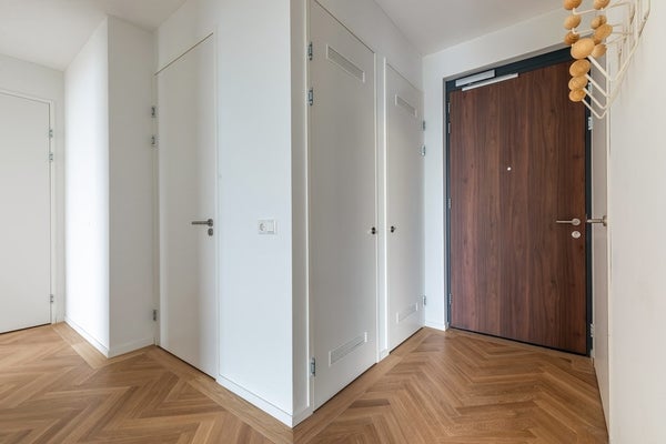 Se accede al apartamento a través de un pequeño pasillo que conecta todas las habitaciones. Hay una sala de almacenamiento, un baño separado, un baño, 2 habitaciones y una sala de estar con cocina abierta.