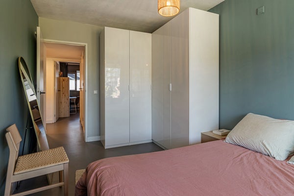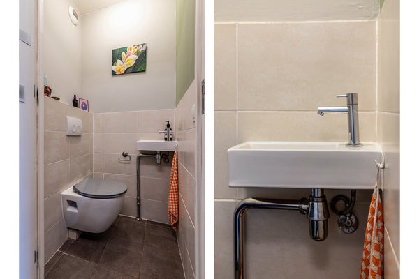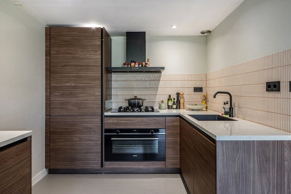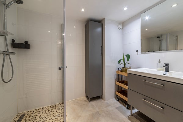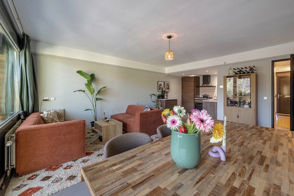 Pasillo con acceso a todas las habitaciones. En la parte trasera, encontrarás la amplia sala de estar con una lujosa cocina abierta (completamente renovada en 2025). La cocina está equipada con todos los electrodomésticos empotrados imaginables. Piensa en un horno extra ancho, una combinación de frigorífico-congelador extra ancha, lavavajillas y más que suficiente espacio de almacenamiento. Las puertas francesas dan acceso al soleado jardín de 60m². El jardín soleado se encuentra en un entorno verde, similar a un parque, junto al agua. Aquí experimentas una completa tranquilidad, con árboles y barcos que pasan. Un lugar especial donde casi olvidas que vives en medio de la ciudad.