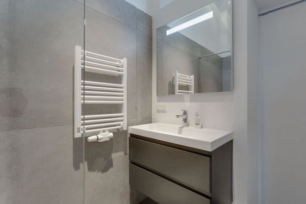 La propiedad cuenta con dos bien dimensionadas habitaciones, que se pueden utilizar de forma flexible como dormitorios, oficinas o habitaciones de invitados. El baño está bien equipado y cuenta con ducha, inodoro, lavabo y mueble de lavabo, a juego con el carácter del apartamento.
