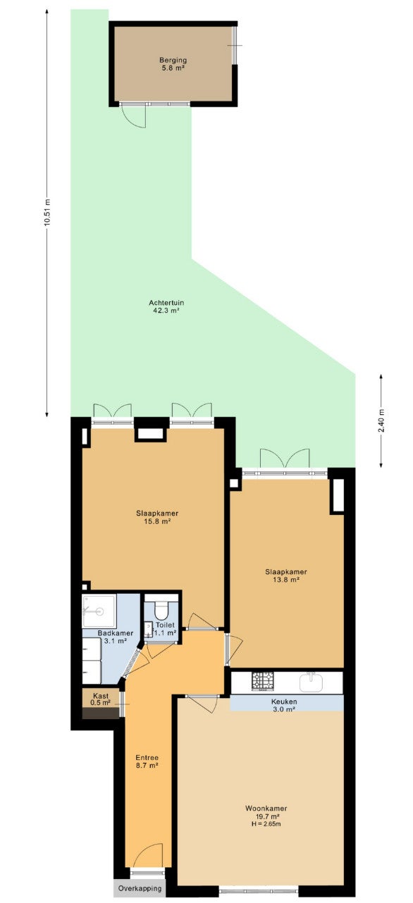 Distribución: El apartamento tiene una entrada propia y está ubicado en la planta baja. El vestíbulo da acceso a la amplia sala de estar y cocina, ambas en la parte delantera del apartamento. La cocina está equipada con electrodomésticos modernos, como una placa de cocción por inducción, horno, lavavajillas, frigorífico y congelador separado. Ambas habitaciones son muy amplias y tienen acceso al jardín de la casa, que también es bastante grande. En la parte trasera del jardín hay un trastero. La ducha se encuentra en el lado izquierdo de la casa y tiene dos lavabos y espacio para una lavadora y una secadora. Hay un baño separado.