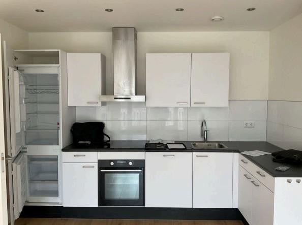 El apartamento se encuentra en el tercer y también último piso. A través de una entrada compartida, se accede al tercer piso por unas escaleras. Se entra en un pasillo que da acceso a todas las habitaciones. En el pasillo hay un baño separado con un lavabo. La sala de estar con cocina abierta es luminosa y espaciosa. La cocina está equipada con electrodomésticos integrados, como una combinación de nevera y congelador, cocina a gas, microondas combinado, extractor y lavavajillas. Hay dos dormitorios, lo que hace que la propiedad también sea adecuada para dos inquilinos trabajadores. El baño tiene una ducha, lavabo y un radiador para toallas.
