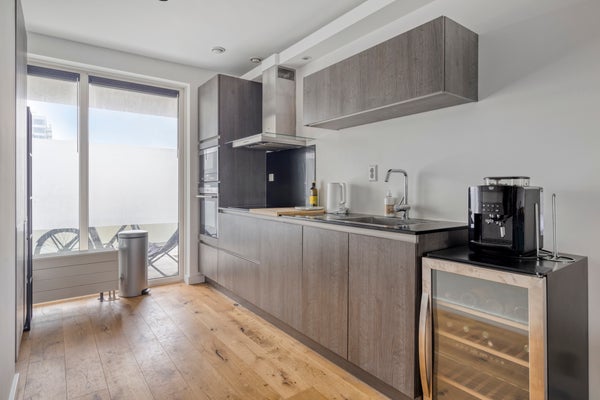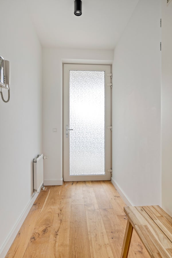 A través de la entrada, llegas al vestíbulo de la propiedad. Si continúas recto, llegas a la espaciosa sala de estar con un área de comedor adyacente, donde grandes ventanales proporcionan luz agradable y una atmósfera abierta. En la parte delantera de la casa se encuentra la cocina moderna, equipada con varios electrodomésticos integrados, incluyendo un refrigerador, una placa de cocción de inducción y un armario de clima. Ideal para los amantes de la cocina.