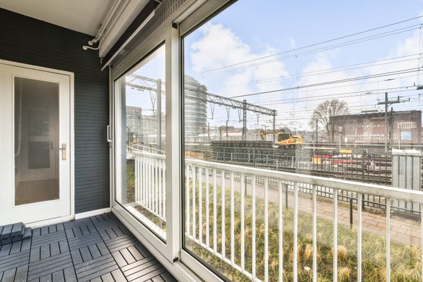 La cocina da acceso a la terraza cerrada, que da a la vía del tren. Es verdaderamente único estar tan cerca de la vía del tren y escuchar tan poco de ella.