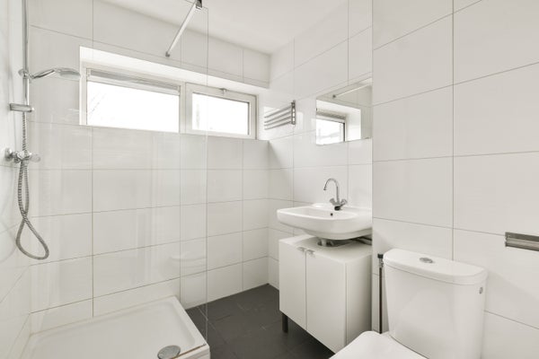 Detrás de la sala de estar hay un segundo pequeño pasillo con acceso al baño. Este está equipado con ducha, segundo inodoro y lavabo.
