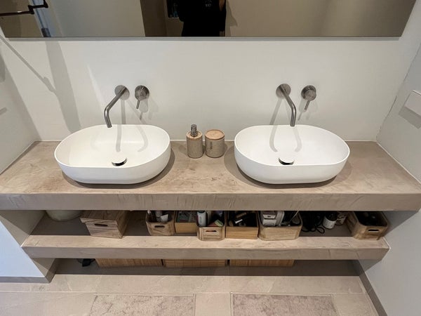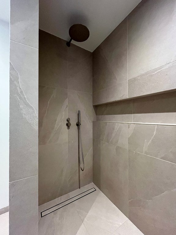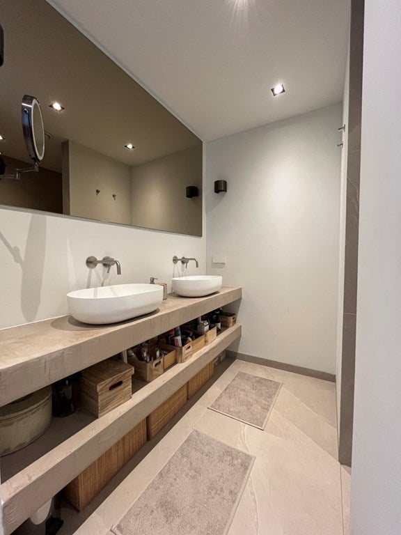 El baño está equipado con una ducha a nivel del suelo con lavabos de solid surface.