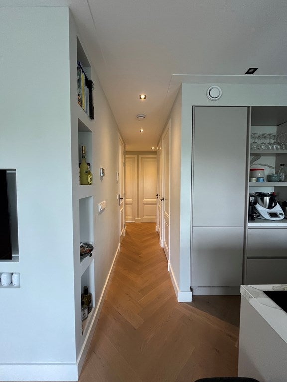 En todo el apartamento hay un suelo de roble con un patrón de espiga y hay focos empotrados en todas partes.