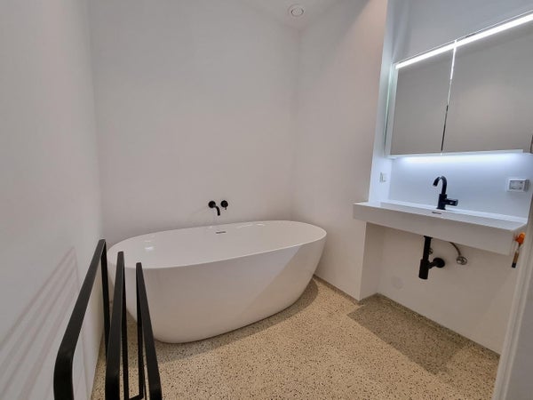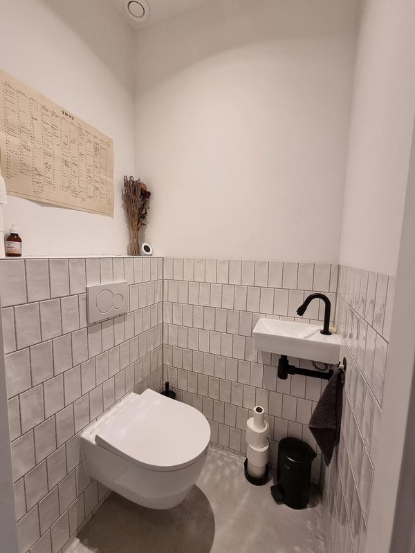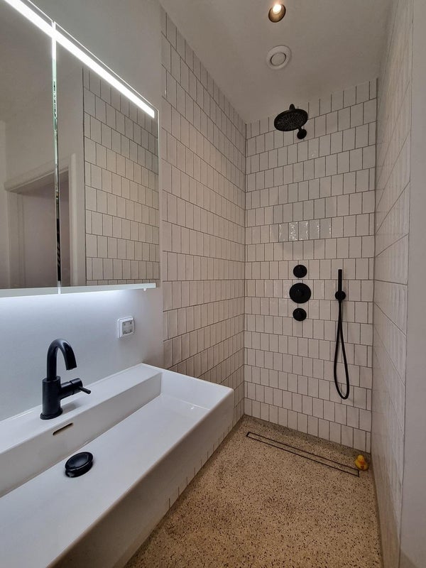 Dormitorio con cama doble y armario empotrado. Baño moderno con ducha a nivel del suelo y bañera. Aseo moderno separado.