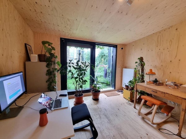 Vestíbulo de entrada, sala de estar espaciosa con cocina abierta totalmente equipada. Desde la sala de estar se accede al gran jardín con una casa de jardín que se ha convertido en una hermosa oficina en casa.