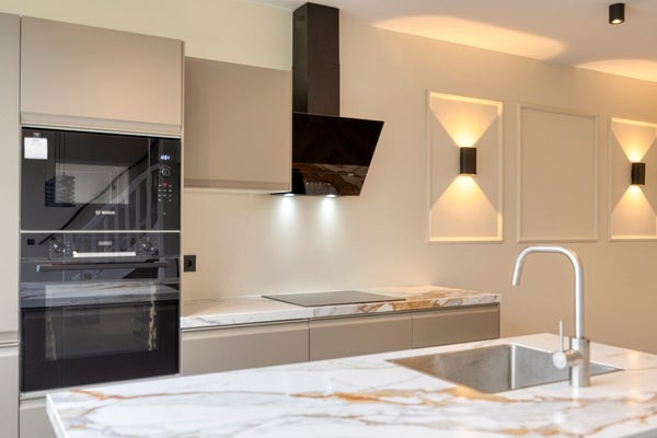 La cocina de nueva construcción es una verdadera atracción. Terminado con una lujosa encimera de mármol, cuenta con un horno doble, una placa de cocción integrada con extractor, grifo de latón, nevera, congelador y lavavajillas, todo perfectamente integrado para un aspecto moderno y elegante.