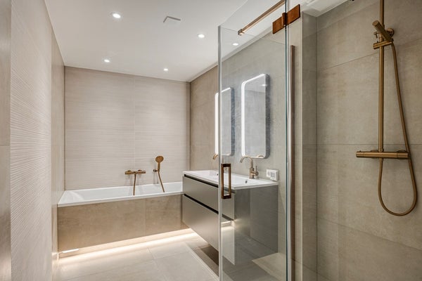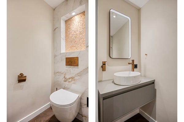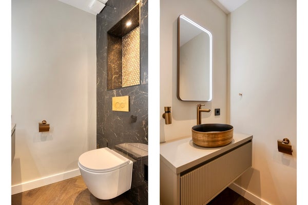 También en este nivel hay un elegante baño para invitados, completo con un elegante mueble de tocador y espejo. Una de las habitaciones también está aquí, ofreciendo acceso directo a una terraza privada en la parte trasera, mientras que el balcón orientado al frente es accesible desde el salón, ideal para disfrutar de tu café de la mañana al sol.