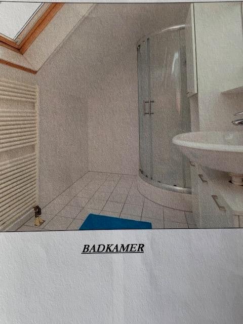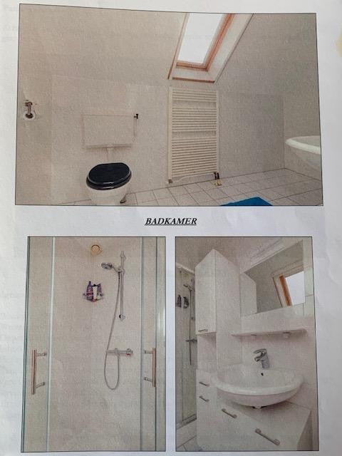 El baño está completamente azulejado en colores claros y dotado de una ducha, WC, mueble de baño con lavabo, radiador de diseño y una ventana de techo Velux.