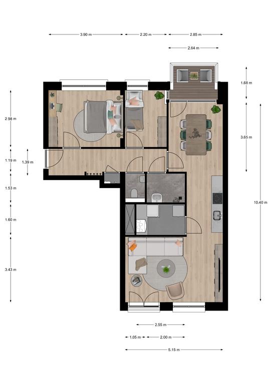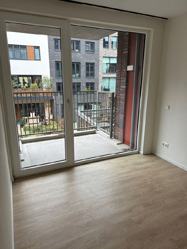 Entrada, ropero, baño con ducha, lavabo, inodoro, amplio salón/comedor con cocina moderna, que está equipada con un lavavajillas integrado, placa de inducción, campana extractora, horno combinados/microondas y una combinación de frigorífico/congelador. En la parte trasera del apartamento encontrará las dos habitaciones. El apartamento tiene un balcón tanto en la parte delantera como en la trasera.