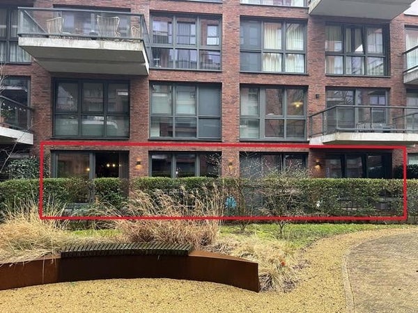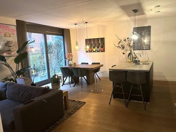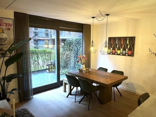 La sala de estar con zona de comedor y cocina abierta cuenta con grandes ventanales. La sala de estar está situada hacia el jardín de la ciudad que se extiende a lo largo de todo el apartamento (aproximadamente 30m2) y desde donde se puede mirar hacia el jardín interior (común) del complejo.