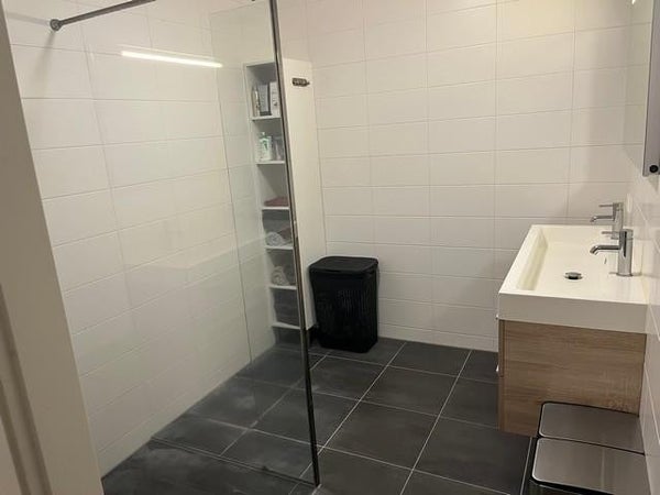 El amplio y modernamente decorado baño está equipado con una ducha a ras de suelo, 2º lavabo y un mueble lavabo con grifería doble.