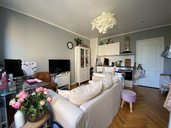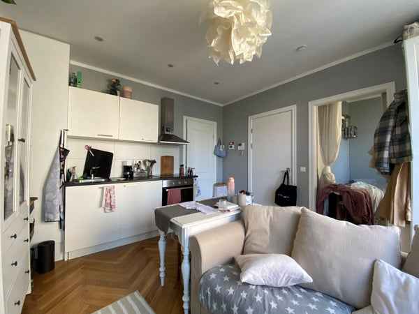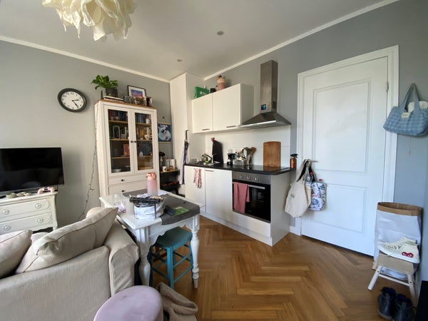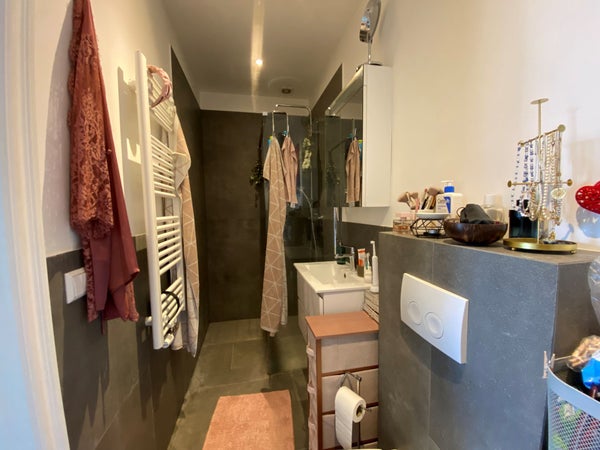 Entrada común en la planta baja. Luego, accede al 3er piso por la escalera. Entrada al apartamento. Amplio y luminoso salón/comedor con cocina abierta equipada con placa de cerámica con extractor y frigorífico y congelador grandes. A la derecha de la sala de estar se encuentra el baño, que está diseñado de forma lujosa y cuenta con ducha, lavabo moderno con cajones y espejo, iluminación empotrada y un inodoro suspendido. Aquí también hay una conexión para la lavadora. El acogedor dormitorio se encuentra en la parte trasera del apartamento. La sala de estar da acceso a la amplia terraza en la parte trasera.