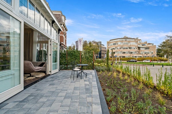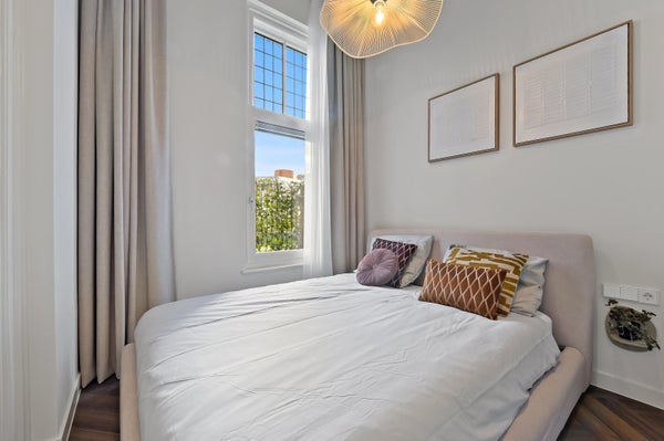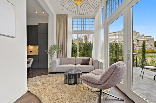 Este encantador estudio se encuentra en la planta baja. La entrada es accesible a través de la puerta principal central del impresionante edificio. Puerta principal con pasillo. Acceso a la cocina, que está equipada con todas las comodidades, como un lavavajillas, una placa de inducción, una combinación de frigorífico y congelador, un Quooker para agua hirviendo al instante y suficiente espacio de almacenamiento. A través de la cocina se accede al impresionante baño con bañera, ducha a ras de suelo, lavabo con mueble, espejo con iluminación y calefacción, y dos radiadores para toallas. Aseo separado en el mismo estilo que el baño. La cocina se extiende hacia el espléndido salón-comedor que ha sido renovado con un parquet en espiga, con puertas francesas dobles que dan a la amplia terraza. A través del salón se accede al amplio dormitorio (aprox. 8 m2). La vivienda es luminosa y lujosa gracias a la altura del techo y las ventanas. Amplio jardín trasero de aproximadamente 30m2 orientado al este. ¡La altura del techo en este apartamento es de nada menos que 3.7 m!