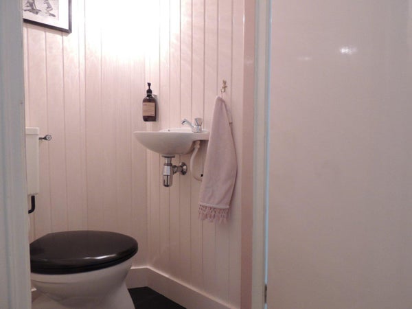 Desde el pasillo se accede al baño separado con lavabo, así como al armario empotrado con lavadora y secadora.