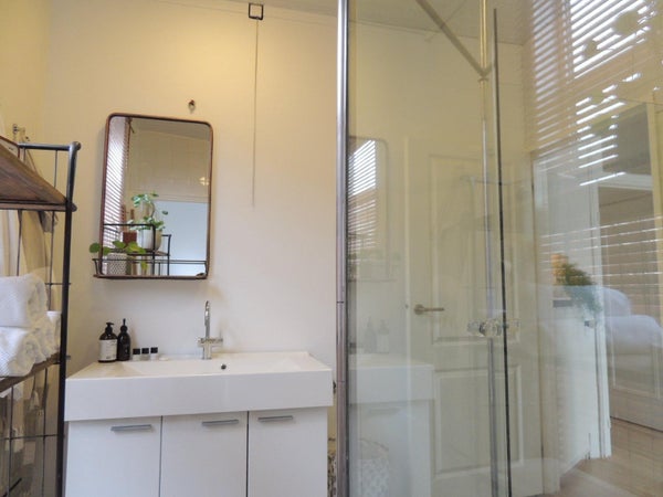 Al lado de la cocina se encuentra el baño con una ducha muy amplia, lavabo con mueble de almacenamiento y acceso al dormitorio trasero.