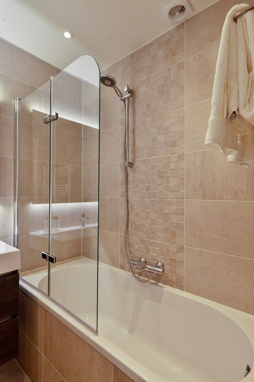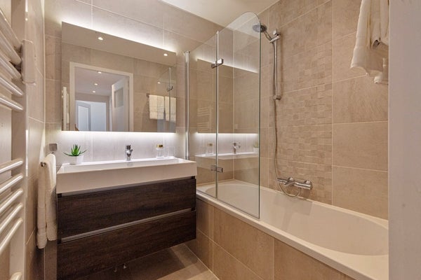 A la derecha del pasillo, encontrarás el baño, que incluye una ducha, una bañera y un lavabo largo simple. También hay un aseo separado y un armario de utilidades que alberga una lavadora y una secadora a lo largo del pasillo. El dormitorio principal es amplio y elegantemente decorado.