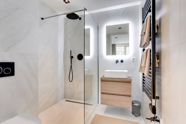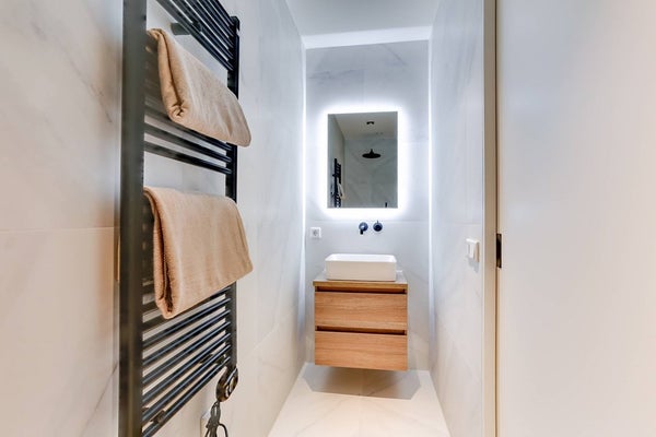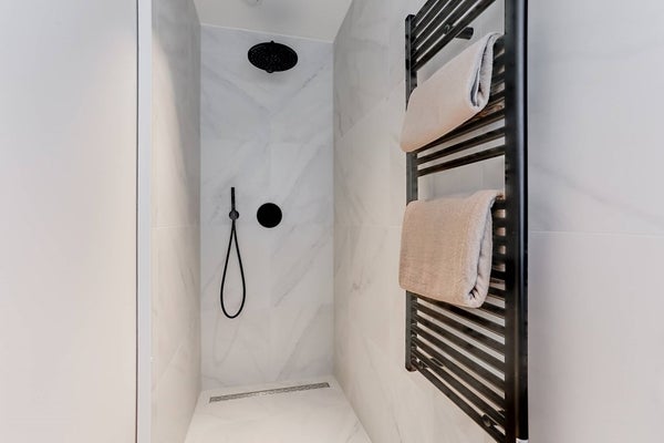 Escaleras que conducen a un pasillo con armario empotrado, que conduce a la segunda habitación con balcón. Baño en suite con ducha a ras de suelo, lavabo doble con gran espejo y un inodoro adicional.