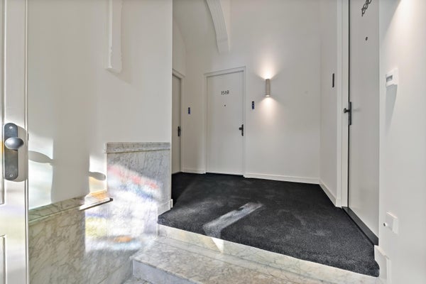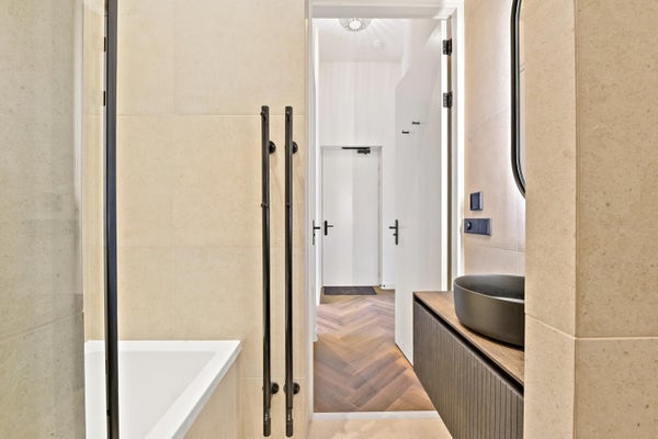 Este encantador apartamento estudio se encuentra en la planta baja. La entrada es accesible a través de la puerta principal central del impresionante edificio. Puerta de entrada con pasillo. Acceso a la espectacular sala de estar renovada con suelo de espiga y cocina abierta. También se accede a través del pasillo al impresionante baño con bañera, ducha a ras de suelo, lavabo con mueble, espejo con iluminación y calefacción y dos radiadores para toallas. Aseo separado en el mismo estilo que el baño. La vivienda es luminosa y lujosa gracias a la altura de los techos y las ventanales. La cocina está completamente equipada, incluyendo un lavavajillas, una placa de inducción, una combinación de nevera-congelador, un Quooker para agua caliente instantánea y suficiente espacio en los armarios. Bonita zona de dormir en la parte delantera del edificio de aproximadamente 9m2. Amplio jardín trasero de aproximadamente 20m2 orientado al este. ¡La altura del techo en este apartamento es nada menos que 3,7 m!