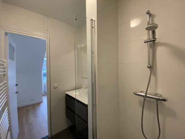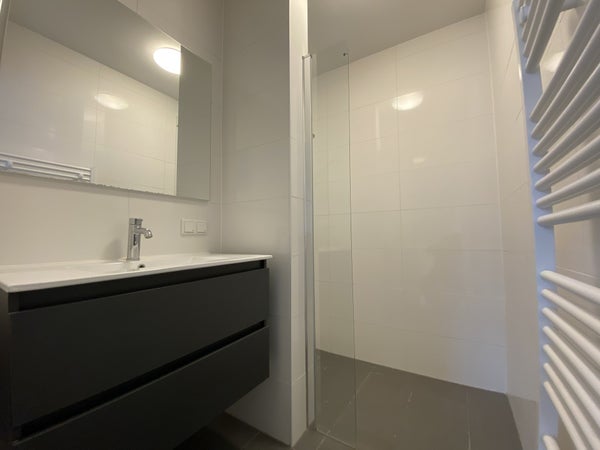 En la parte delantera del apartamento se encuentra la primera habitación (dormitorio). Esta habitación ofrece acceso directo al lujoso baño equipado con un lavabo con cajones, ducha a ras de suelo y un radiador para toallas.