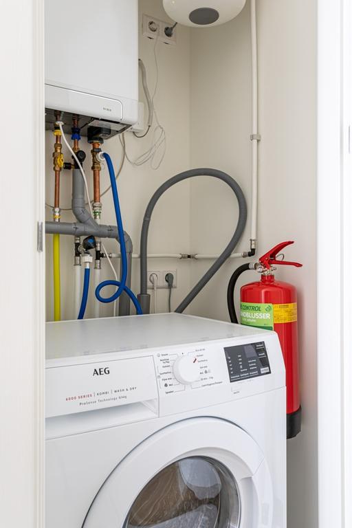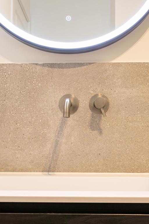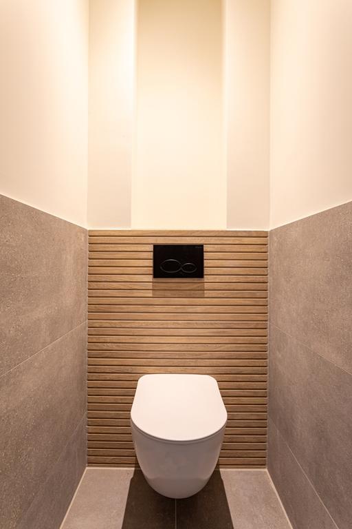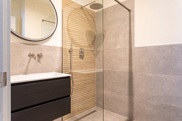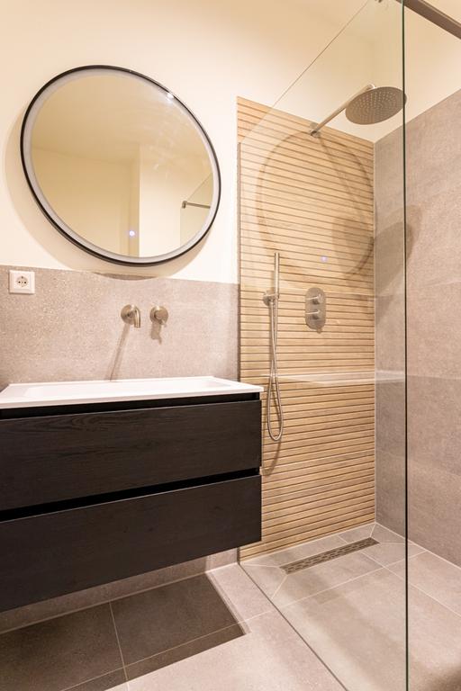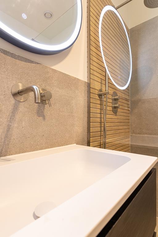 Entrada en la planta baja. Aseo separado. Baño moderno con ducha a ras de suelo y lavabo. Sala de estar con cocina abierta moderna, puertas de patio hacia la terraza.