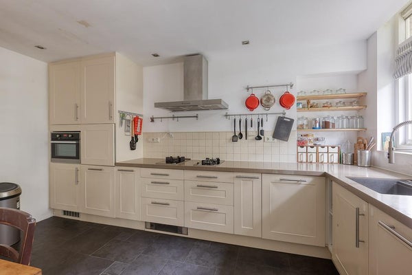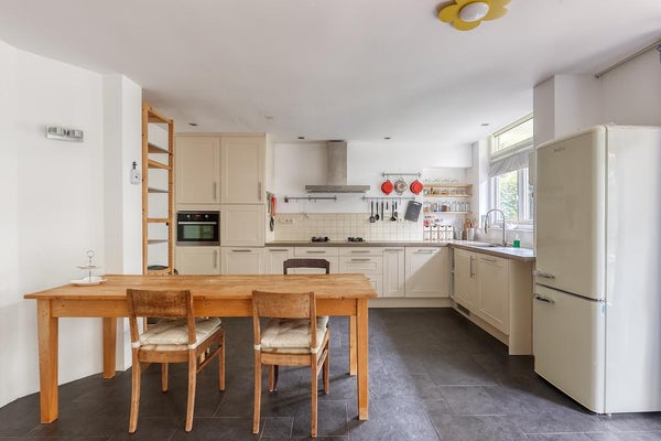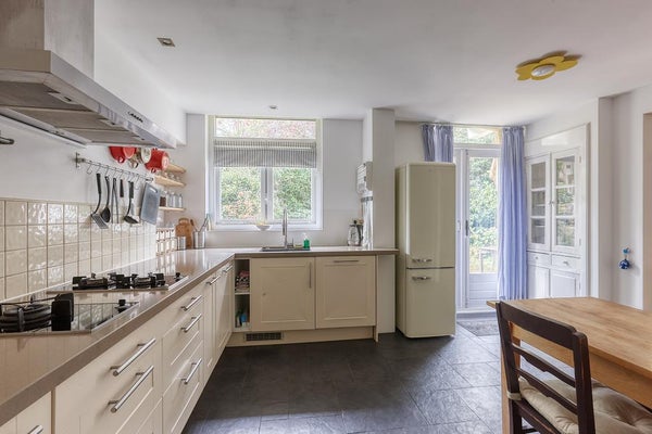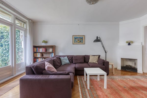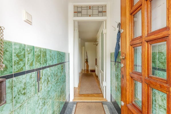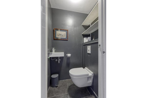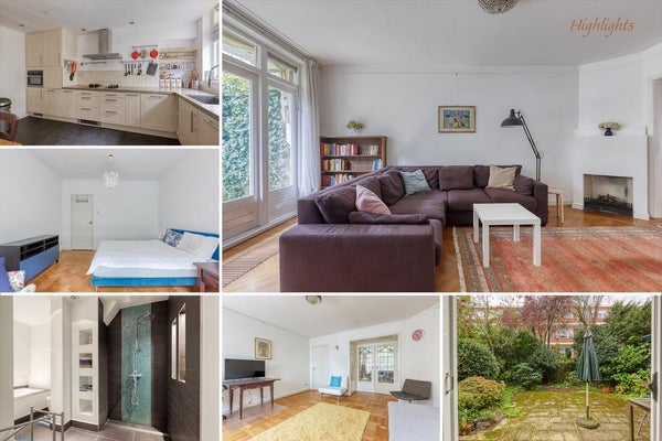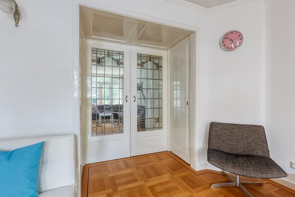 Un vestíbulo característico con una puerta de vidriera. El pasillo da acceso a todas las habitaciones y ofrece espacio de almacenamiento. Hay un baño separado con un pequeño lavabo. La amplia sala de estar en suite cuenta con una acogedora chimenea y se beneficia de mucha luz natural gracias a las grandes ventanas. A través de las puertas francesas, tienes acceso al encantador jardín (aproximadamente 105 m²), que disfruta de mucho sol (al suroeste). La moderna cocina abierta está equipada con todos los electrodomésticos necesarios, como una placa de gas Miele con quemador wok, campana extractora, horno combinado, lavavajillas Miele y frigorífico-congelador.