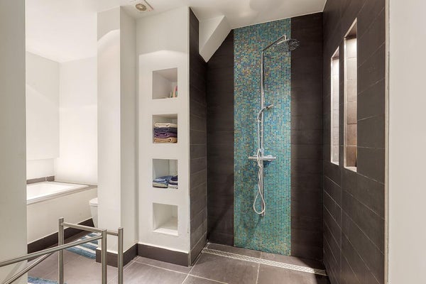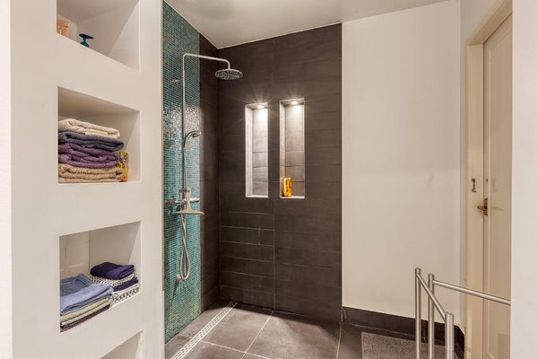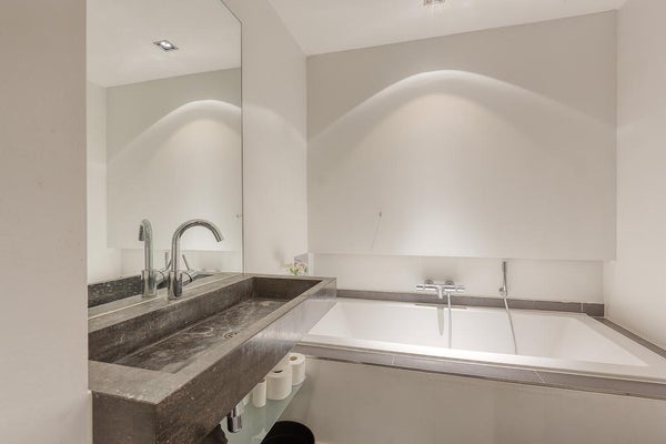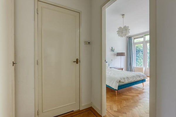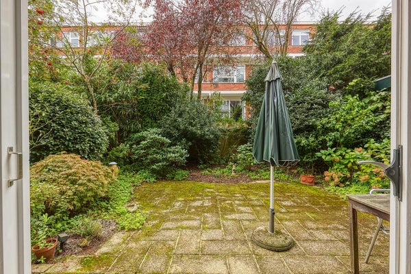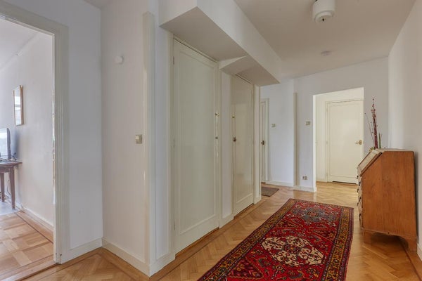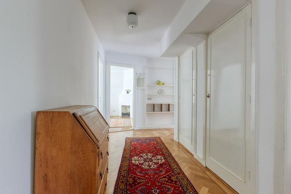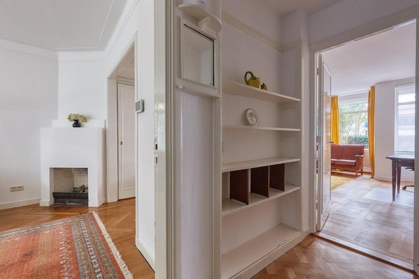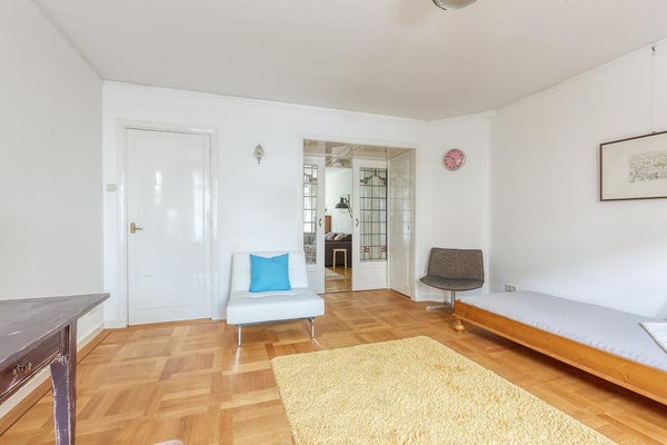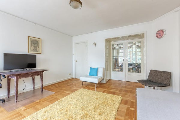 El apartamento tiene 2 habitaciones. La habitación principal está ubicada en la parte delantera y está equipada con un armario empotrado. La segunda habitación se encuentra en la parte trasera del apartamento, con puertas francesas que dan al jardín. El lujoso baño cuenta con bañera, ducha de lluvia tipo walk-in, lavabo con mueble, un segundo inodoro y calefacción por suelo radiante.
