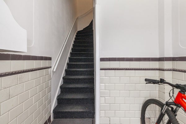 Entrada, escaleras al primer piso, amplio desván, nuevo inodoro con lavabo, hermoso salón (aproximadamente 30 m2) en la parte delantera con armario empotrado y chimenea. Desde el amplio salón se accede a la amplia y completamente nueva cocina (5,80 m2) con frigorífico, congelador, placa de inducción, horno, campana extractora y conexión para la lavadora. El nuevo baño está equipado con una ducha, mueble de lavabo y toallero de diseño. Hay 2 amplias habitaciones (1ª habitación casi 22 m2 y 2ª habitación de 9 m2) en la parte posterior. También hay un balcón en la parte trasera. El apartamento tiene un suelo de laminado.
