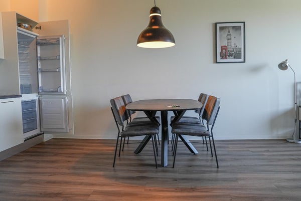 El apartamento cuenta con una sala de estar y cocina de planta abierta. La moderna cocina blanca brillante está equipada con una placa de cocción cerámica, campana extractora de acero inoxidable, fregadero con grifo mezclador, nevera con congelador grande, lavavajillas y una combinación de microondas/horno.
