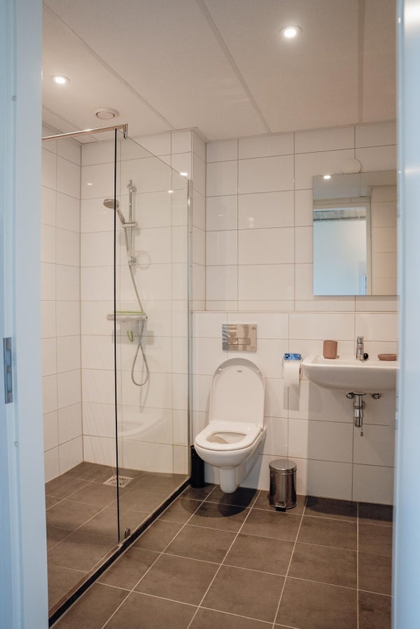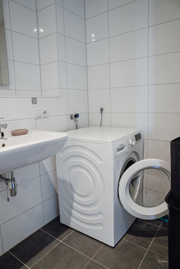Desde la sala de estar, se puede acceder al dormitorio y al cuarto de baño. El baño completamente azulejado cuenta con azulejos de pared de color blanco brillante y baldosas de suelo en color antracita. El lujoso baño está equipado con una ducha a ras de suelo con grifo mezclador, radiador de diseño, lavabo e inodoro suspendido, y lavadora.