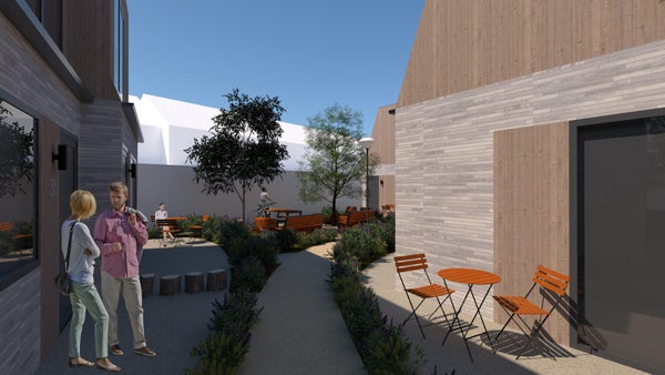 La arquitectura del proyecto es moderna y cálida, combinando ladrillos de alta calidad y revestimientos de madera natural. Grandes ventanales aseguran una agradable entrada de luz y una apariencia abierta. Las viviendas se encuentran a lo largo de un camino sinuoso que atraviesa el patio, conectando varias áreas de descanso, terrazas y lugares de encuentro. El patio está ricamente plantado con vegetación y árboles, formando un lugar central donde los residentes pueden relajarse o conocerse.