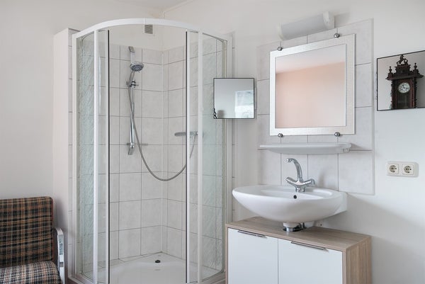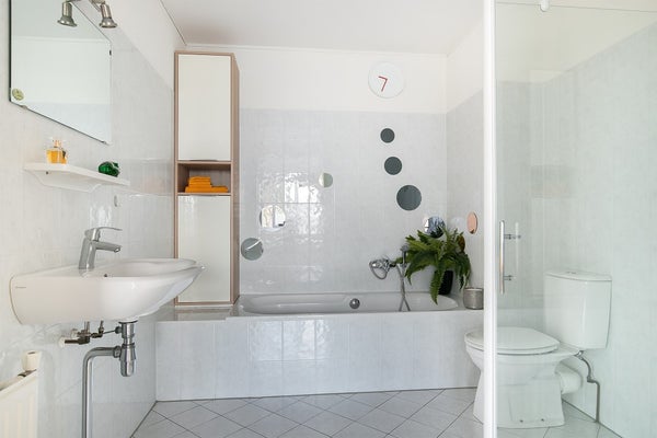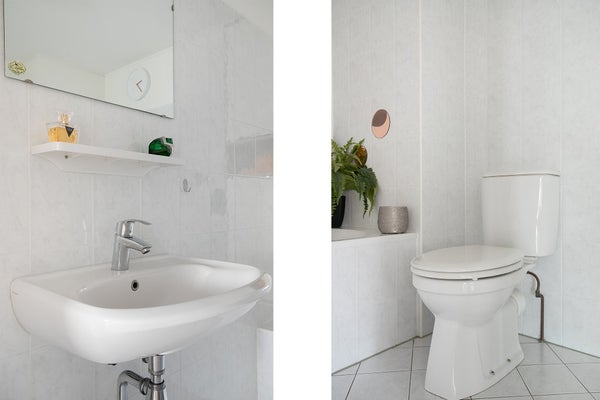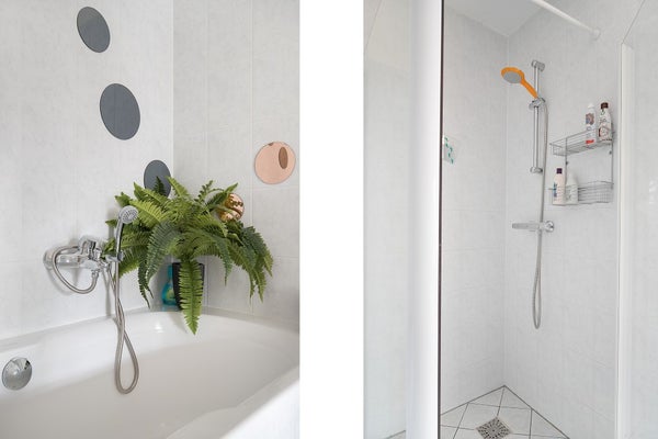 El baño está equipado con una bañera, ducha separada, segundo inodoro y lavabo. Además, hay un inodoro para invitados separado en el pasillo.