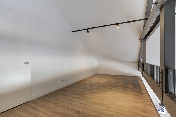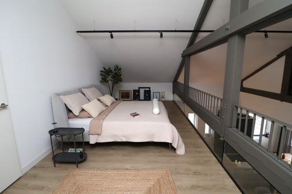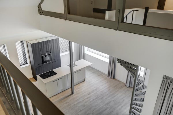 Loft de lujo (107m²) con dos dormitorios, una amplia zona de altillo (oficina o tercer dormitorio), una luminosa sala de estar con cocina abierta con isla de cocina, un generoso balcón, un techo que llega hasta el pico, dos plazas de aparcamiento, una de las cuales se encuentra en el garaje subterráneo y dos trasteros, uno privado y uno compartido.